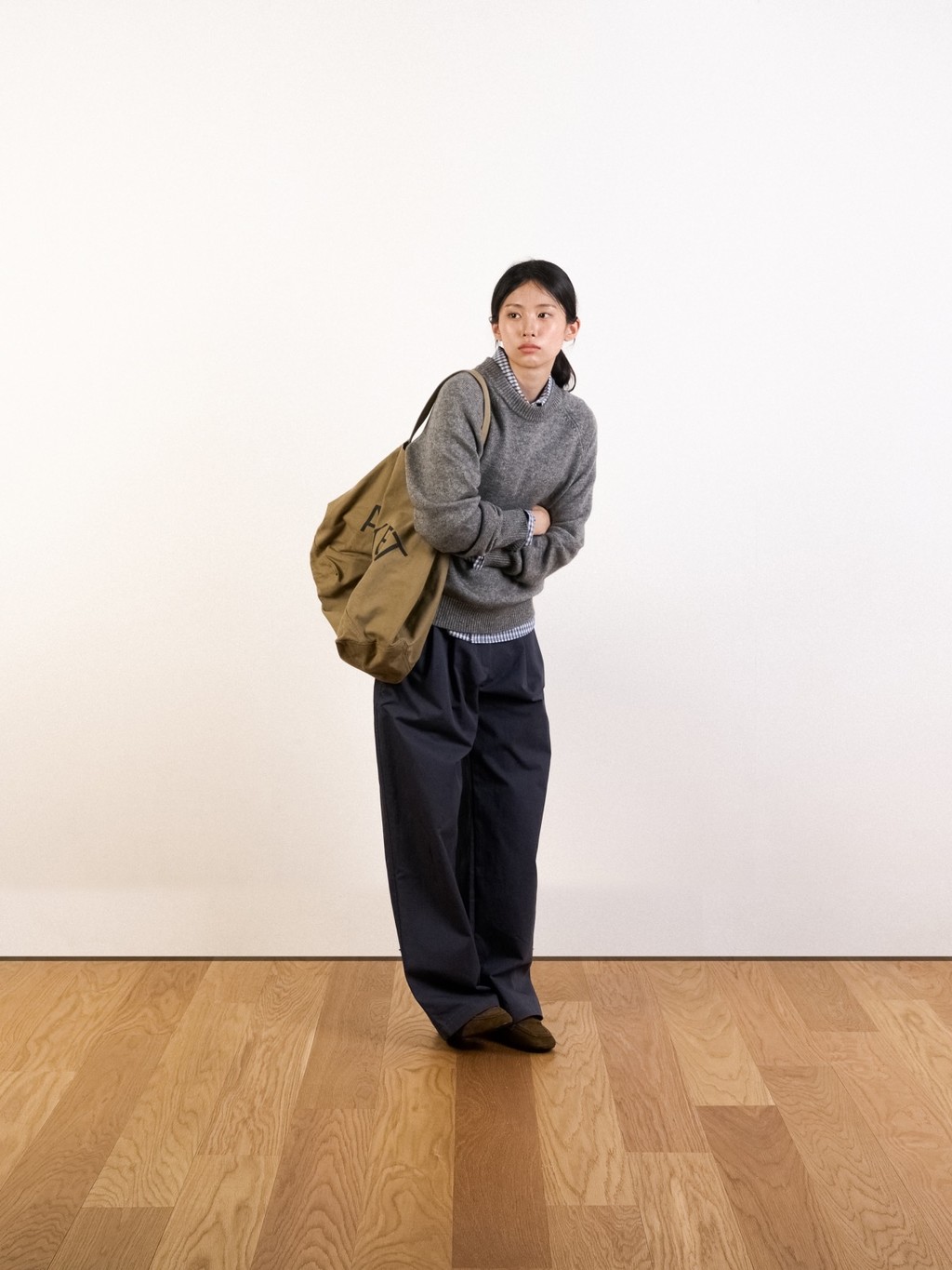 자연스럽게 이어지는 어깨선과 넉넉한 품이 포근한 분위기를 더해줍니다.