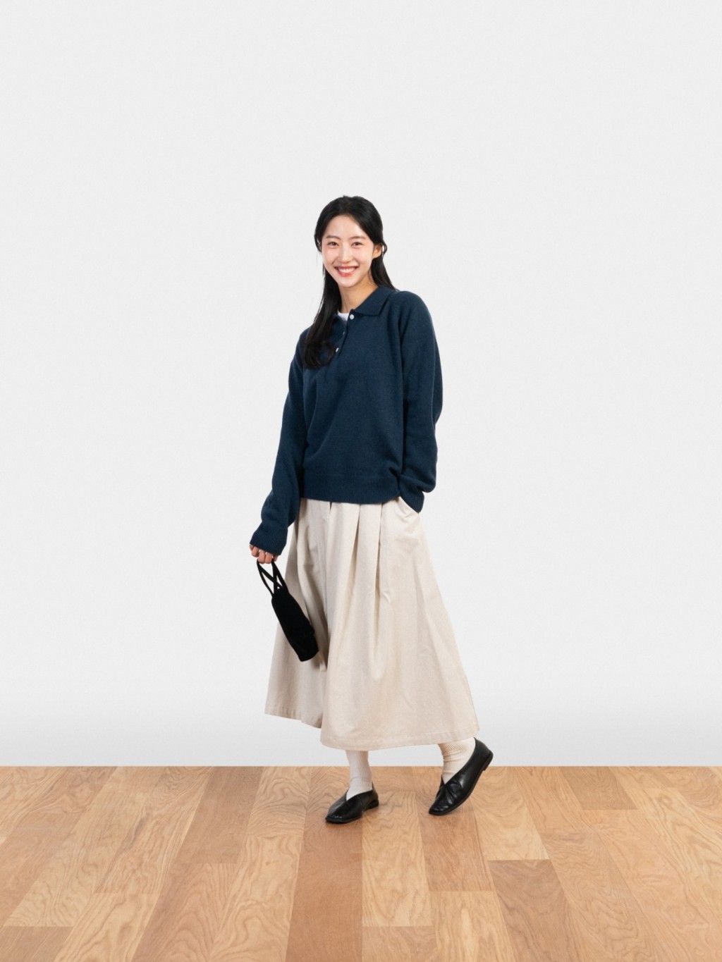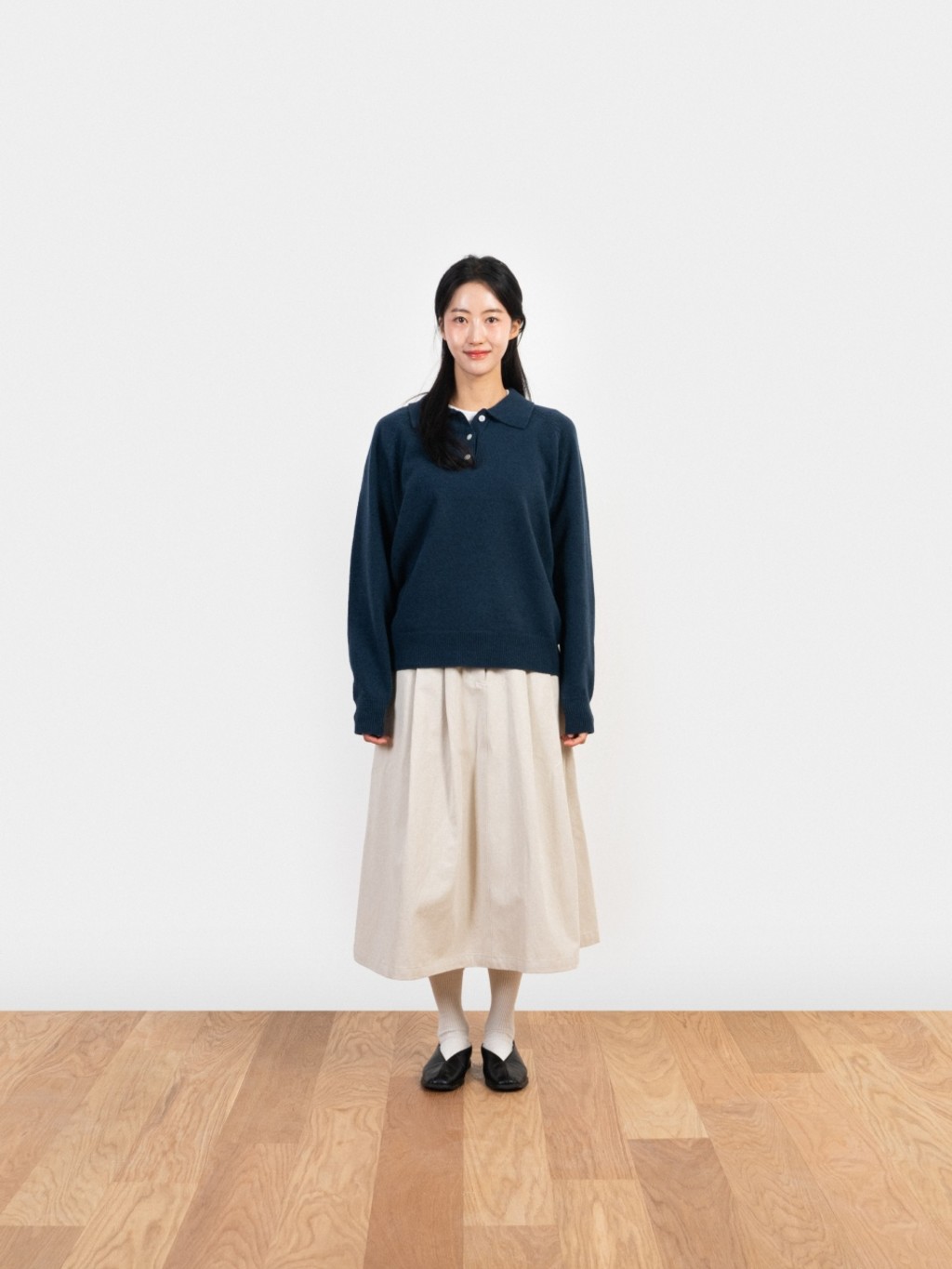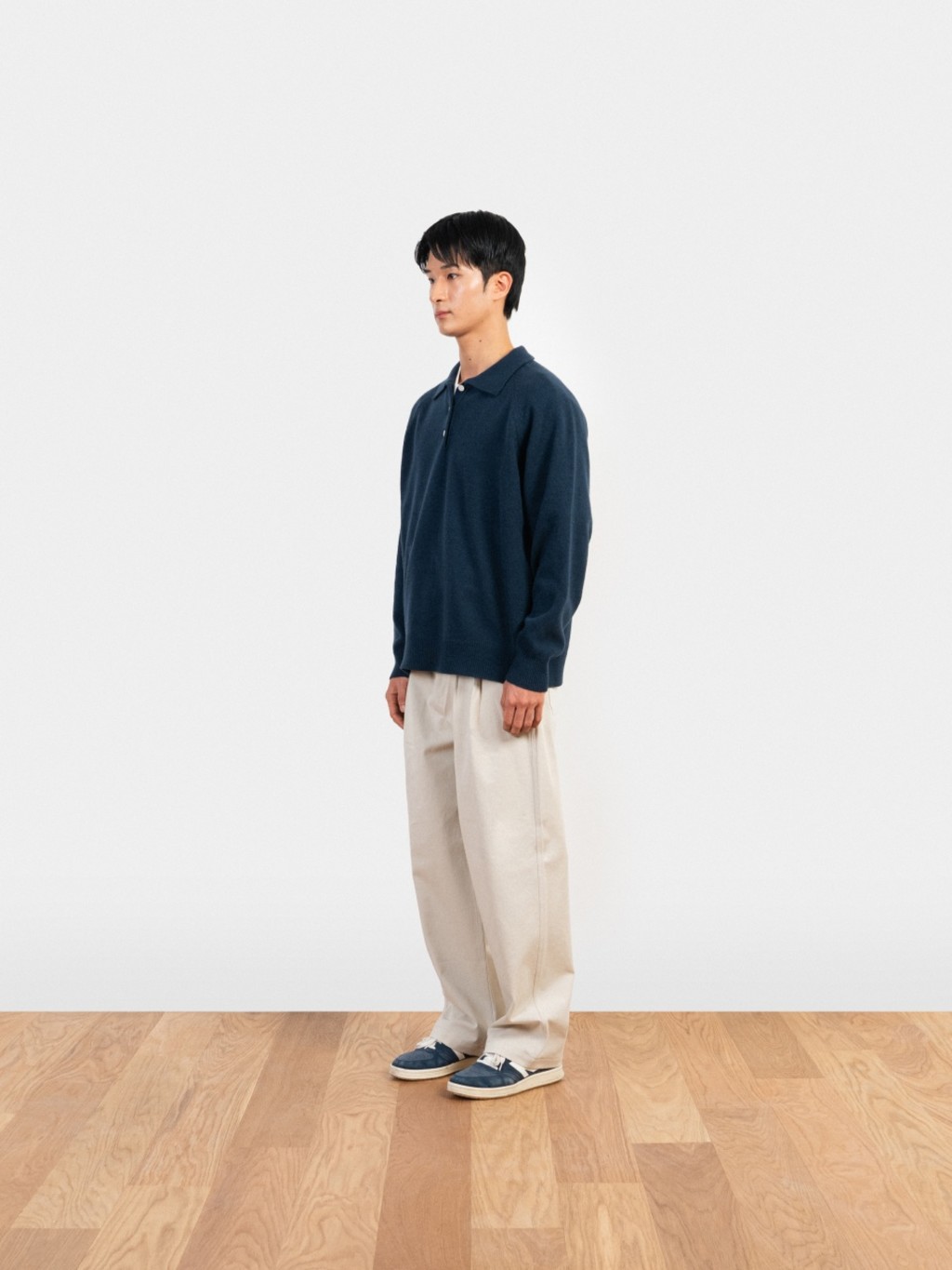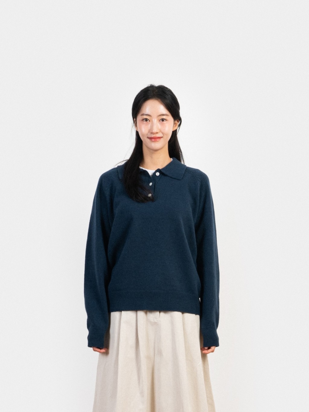 부드러운 촉감과 여유로운 실루엣으로 봄날 일상에 자연스럽게 어우러지는 카라 니트
