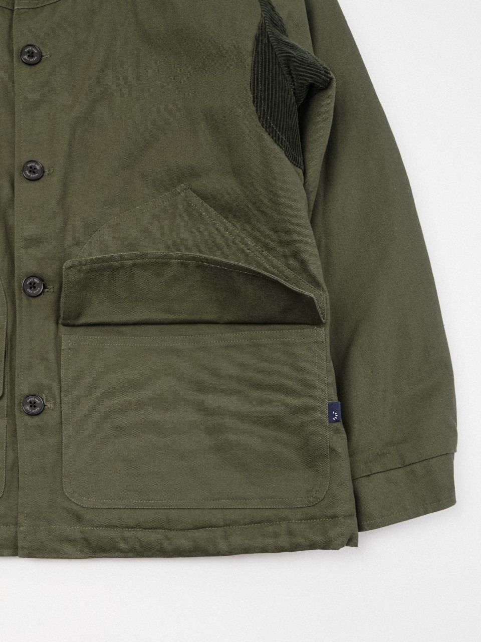 견고한 10수 캔버스 원단을 사용하여 울이나 가죽 소재의 헌팅 자켓보다 가벼워 활동적인 아웃도어 활동에 적합합니다. 내부에는 두께감 있는 퀼팅 안감과 넉넉한 어깨선의 실루엣을 적용하여 다양한 이너와 함께 한겨울에도 레이어드하여 착용하기 좋습니다.