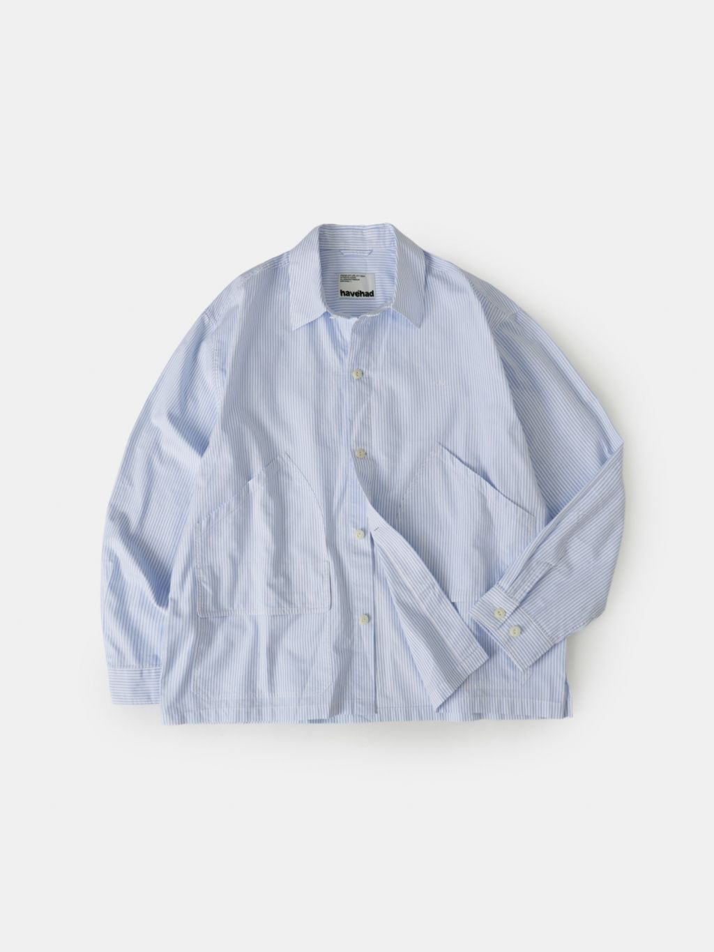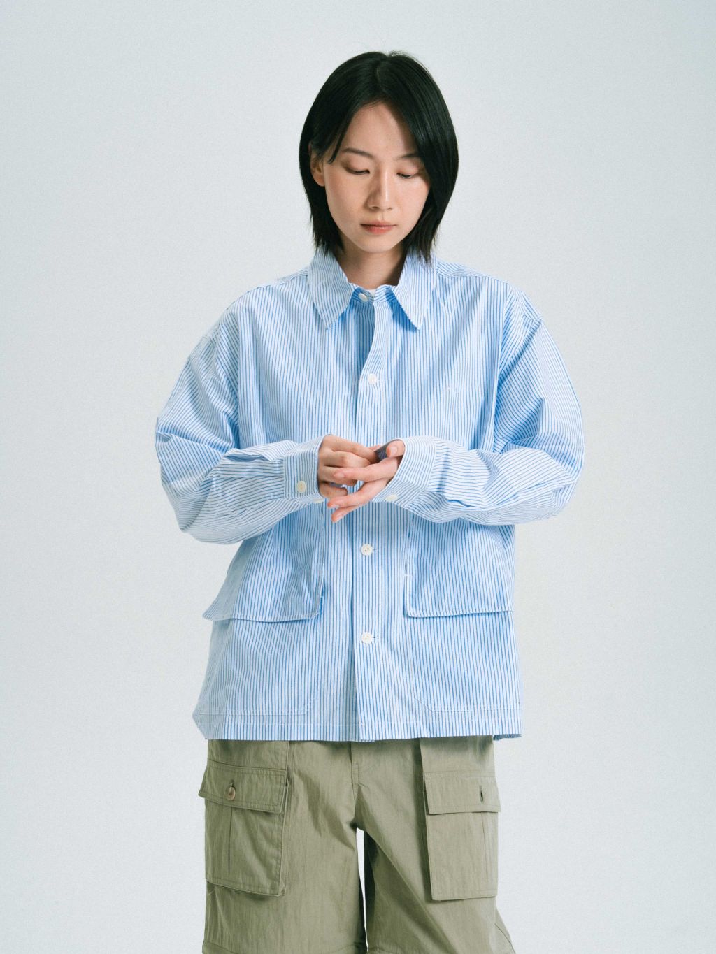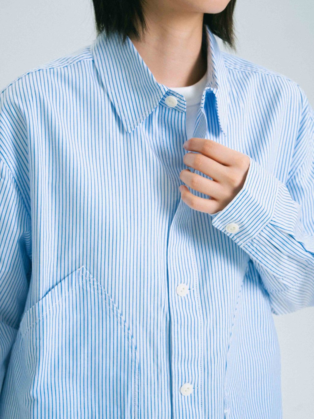 가벼운 40수 면 원단으로 제작되어 부드러운 질감과 가벼운 착용감을 제공합니다. 넓은 간격의 얇은 스트라이프 패턴이 부담 없이 포인트를 더하며, 필드 자켓에서 영감을 받은 사선 포켓과 포켓 플립이 좌우에 있어 아우터로서의 느낌도 살릴 수 있습니다.