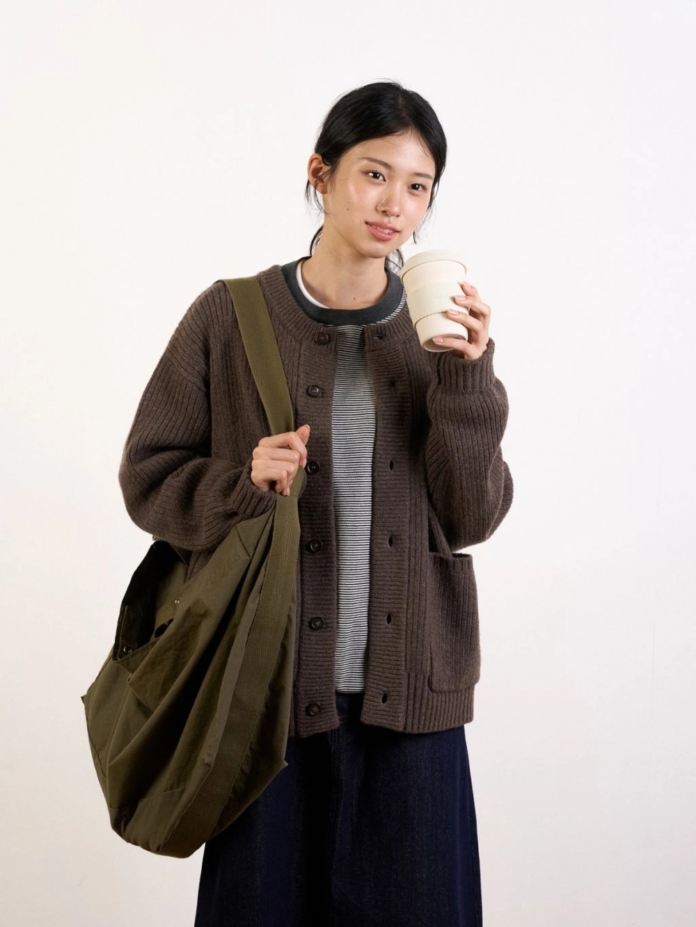 스트라이프 컬러 중 한 톤을 시보리에 반영해 넥라인과 소매단의 마무리가 안정감 있게 어우러집니다.