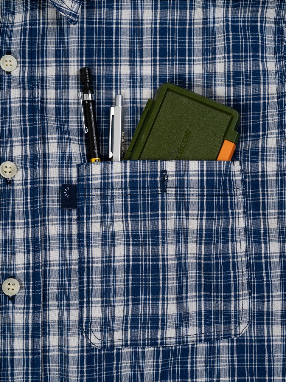 두 개의 정사각 포켓이 셔츠의 중심을 잡아주며, 체크 패턴과 자연스럽게 어우러지는 구조