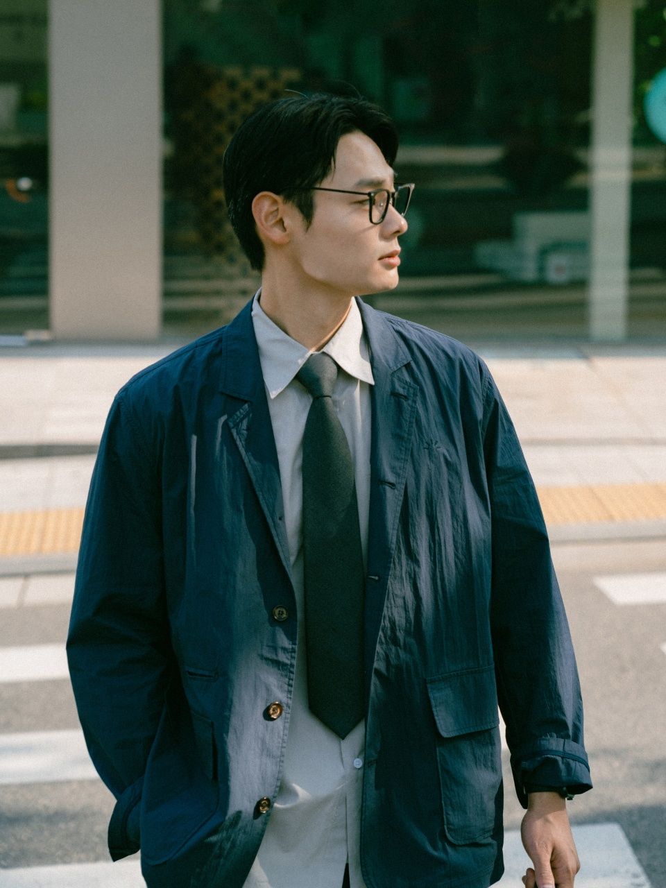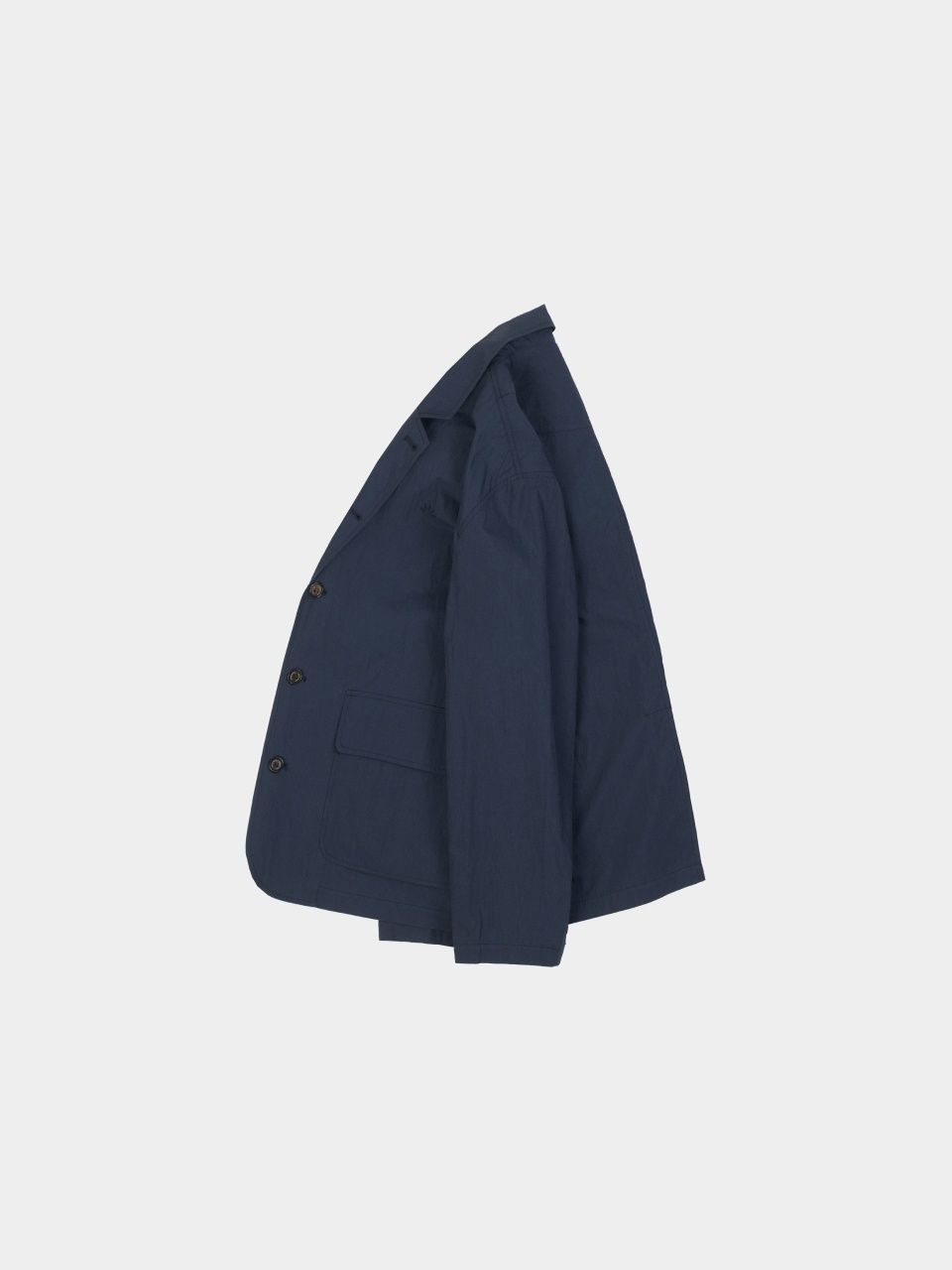 얇고 바스락거리는 코튼 나일론 혼방 원단으로 여름에도 부담 없이 착용할 수 있는 자켓입니다. 3버튼 구조와 세미 오버핏 실루엣은 단정함을 유지하면서도 무겁지 않은 인상을 남깁니다.