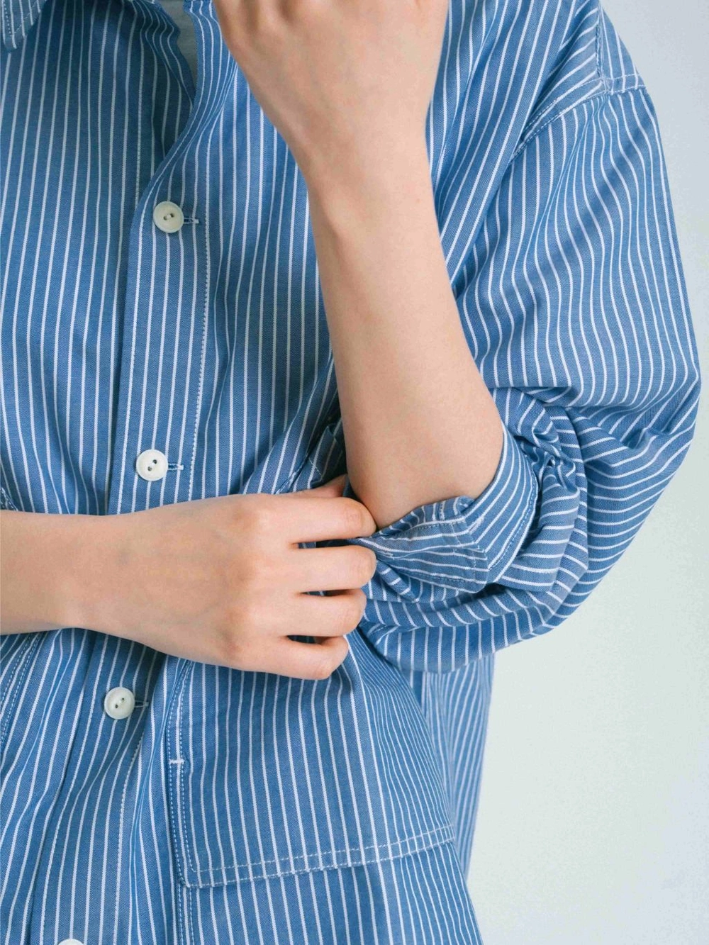 가벼운 40수 면 원단으로 제작되어 부드러운 질감과 가벼운 착용감을 제공합니다. 넓은 간격의 얇은 스트라이프 패턴이 부담 없이 포인트를 더하며, 필드 자켓에서 영감을 받은 사선 포켓과 포켓 플립이 좌우에 있어 아우터로서의 느낌도 살릴 수 있습니다.