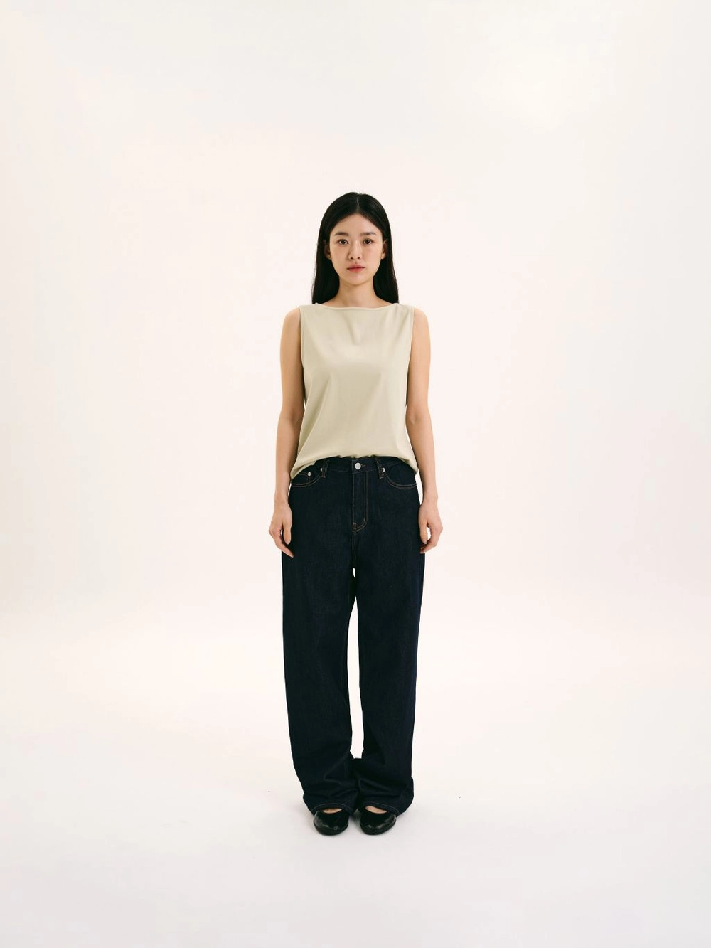 정돈된 실루엣의 보트넥 슬리브리스 탑