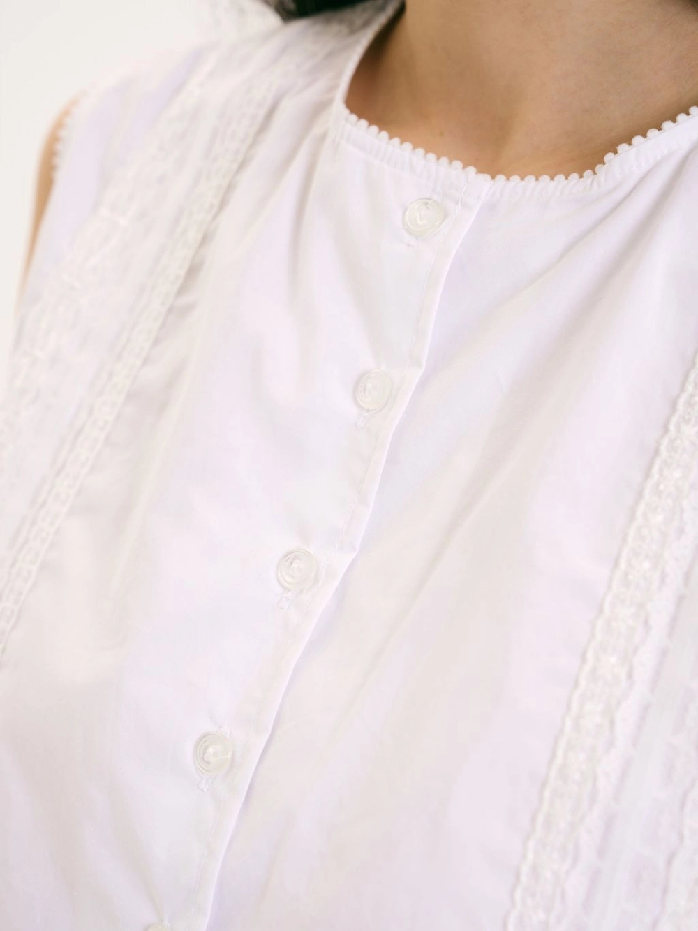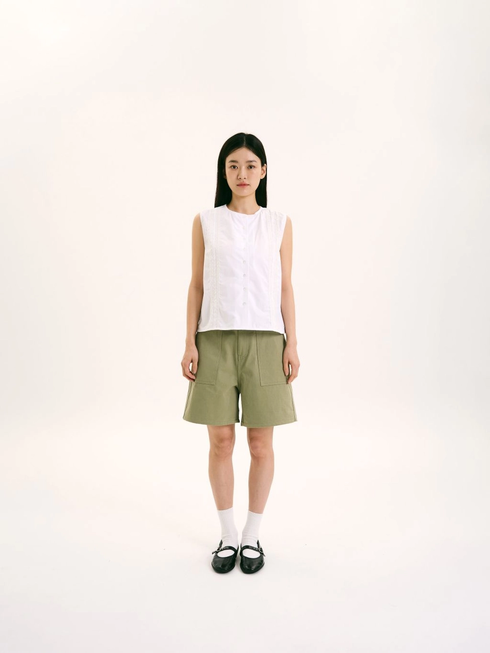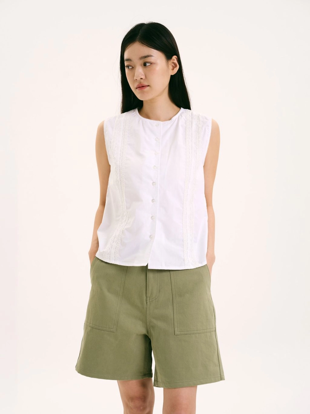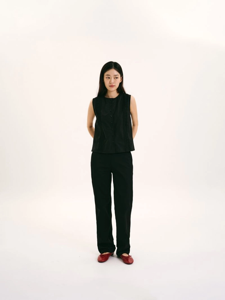 면 100% 40수 원단으로 제작되어 가볍고 통기성이 좋으며, 앞뒤에 들어간 레이스 아플리케가 은은한 페미닌 무드를 더합니다. 단독으로는 물론 레이어드로도 활용 가능하며, 데님 팬츠, 쇼츠, 스커트 등 다양한 하의와 자연스럽게 매치할 수 있는 미니멀한 디자인의 슬리브리스 블라우스입니다.